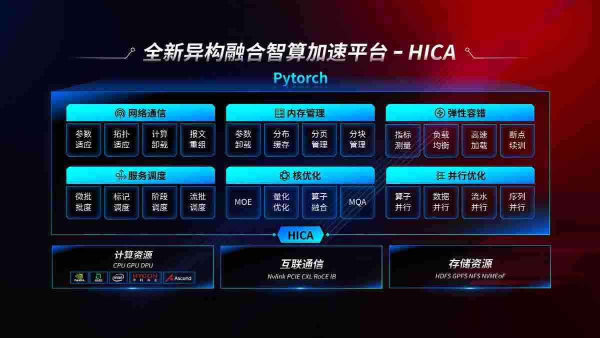通过自研的服务层、、、中间适配层、、以及调度编排算法,,,采用数据并行、、模型并行等多种并行方式,,,,把并行计算任务进行有效的分解,,,,使其分别由相应的软件栈和算力资源来承接。。当GPU资源变化,,HICA可以实时动态调度计算子任务并调整模型拓扑和架构,,,以充分聚合各种算力资源。。。。