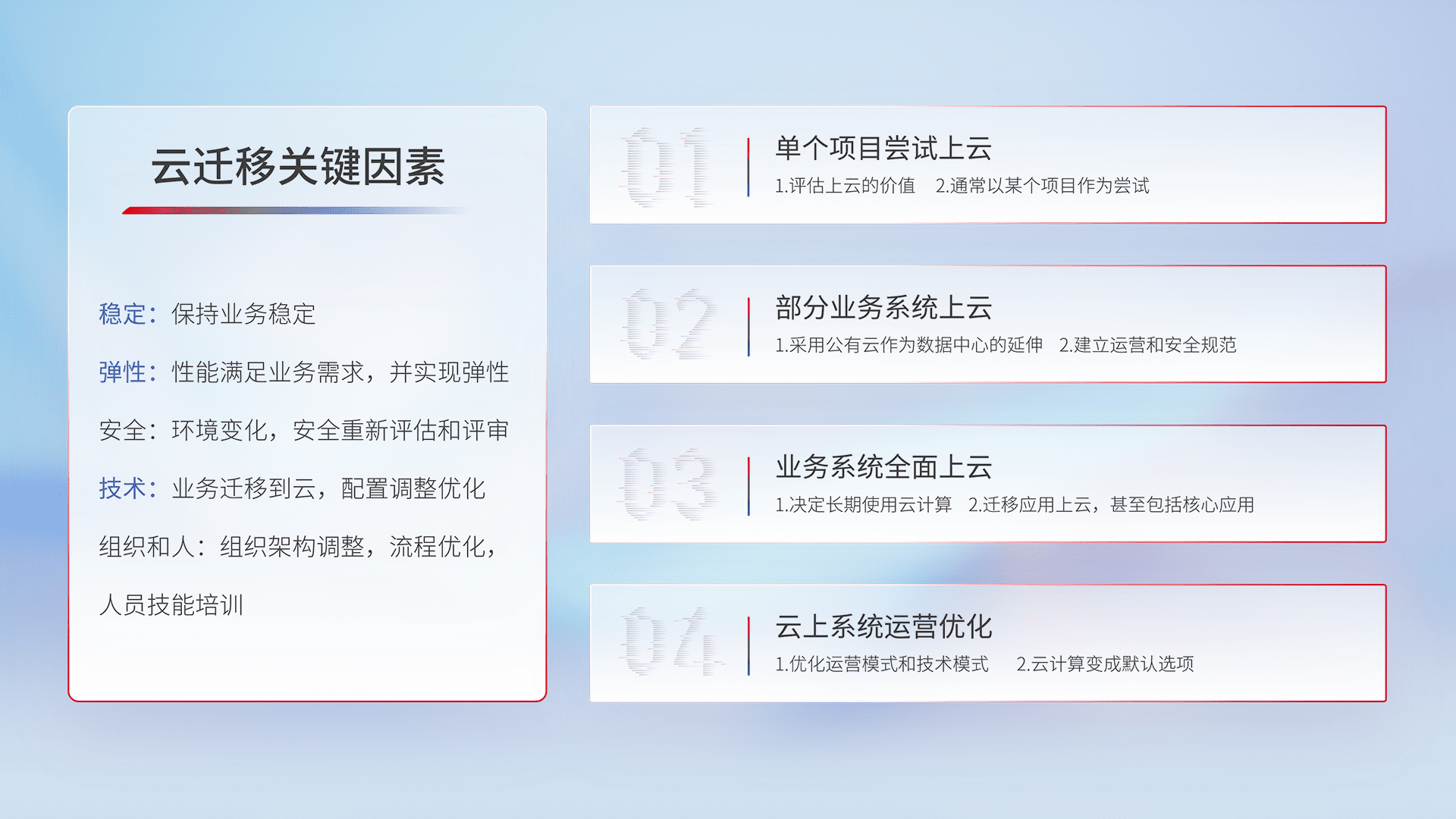 结合实际业务,,从规划设计、、、、云平台选型、、云原生改造、、、数据迁移、、、、集成交付,,,迁移全过程为客户识别最佳上云路径,,做好风险识别管理,,设计网络架构、、身份权限、、、安全审计合规、、、、操作审计、、日志审计、、、、监控告警策略、、多站点容灾设计等,,,对云上基础设施进行整体规划,,,,提升IT治理水平,,,以满足弹性、、、、高可用、、高性能的需求。。。