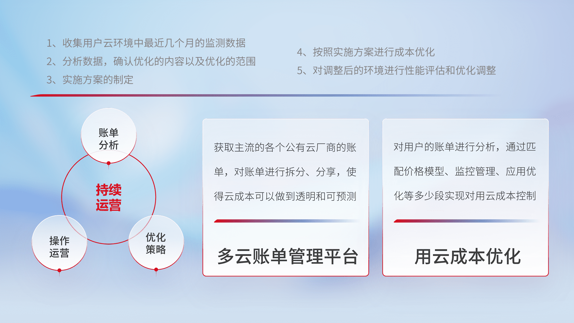 通过多云纳管,,,以统一的资源数据模型把客户的云资源进行抽象和封装,,,进而实现对多云资源的统一操作,,保障云资源管理的可靠性、、、稳定性与可用性。。。量身定制化运维内容,,,配置、、开发运维、、、补丁管理、、、、备份、、监控、、认证和访问管理、、审计和日常巡检等,,,,保障在用云过程中的可靠度,,,稳定度以及高可用率。。。